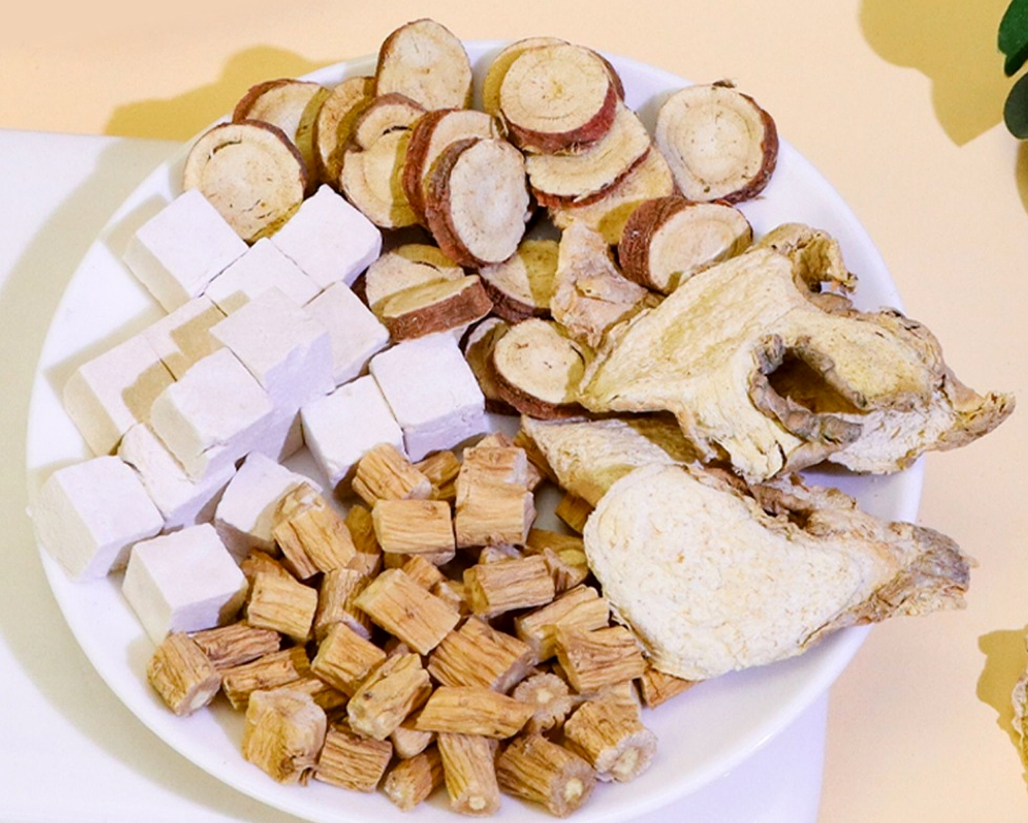 Nhân sâm giữ vai trò chủ soái, vị cam tính ôn, bổ trung ích khí, nâng đỡ nguyên khí của tỳ vị. Ngày nay thường thay bằng Đảng sâm hoặc Thái tử sâm với lượng 10 - 12g, phù hợp tính chất lâm sàng. Bạch truật là vị thần dược trong bài, kiện tỳ táo thấp, giúp trung tiêu kiện vận; Phục linh lại sở trường kiện tỳ thẩm thấp, điều hòa thủy dịch; còn Chích cam thảo điều hòa các vị thuốc, hoãn trung chỉ thống, đôi khi có thể bỏ nếu sâm và truật đã quá ngọt. Cùng nhau, bốn vị như bốn trụ cột chống đỡ trung tiêu, khiến tỳ vị vận hóa hồi phục, khí hóa được khởi động. Vì vậy Tứ quân tử thang được xem như tổ phương kinh điển của nhóm phương kiện tỳ bổ khí - hễ gặp chứng khí hư đều có thể từ đây mà gia giảm.
